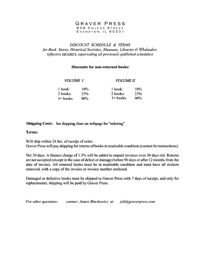 We will calculate discounts according to our discount schedule and send an invoice with your shipment. (Because of increased credit card company fees, Graver Press will no longer be able to accept credit card payments; payment by check or money order only.)